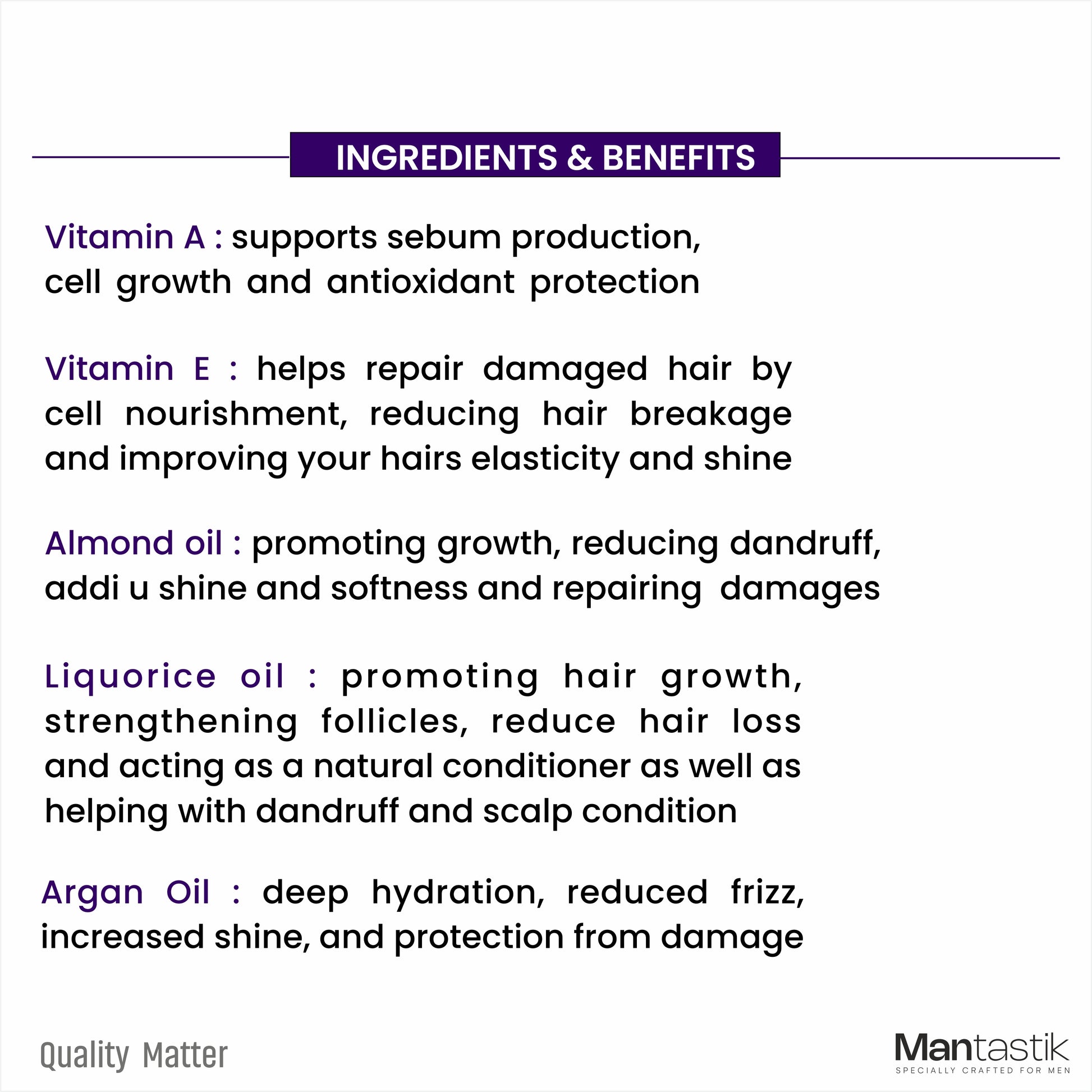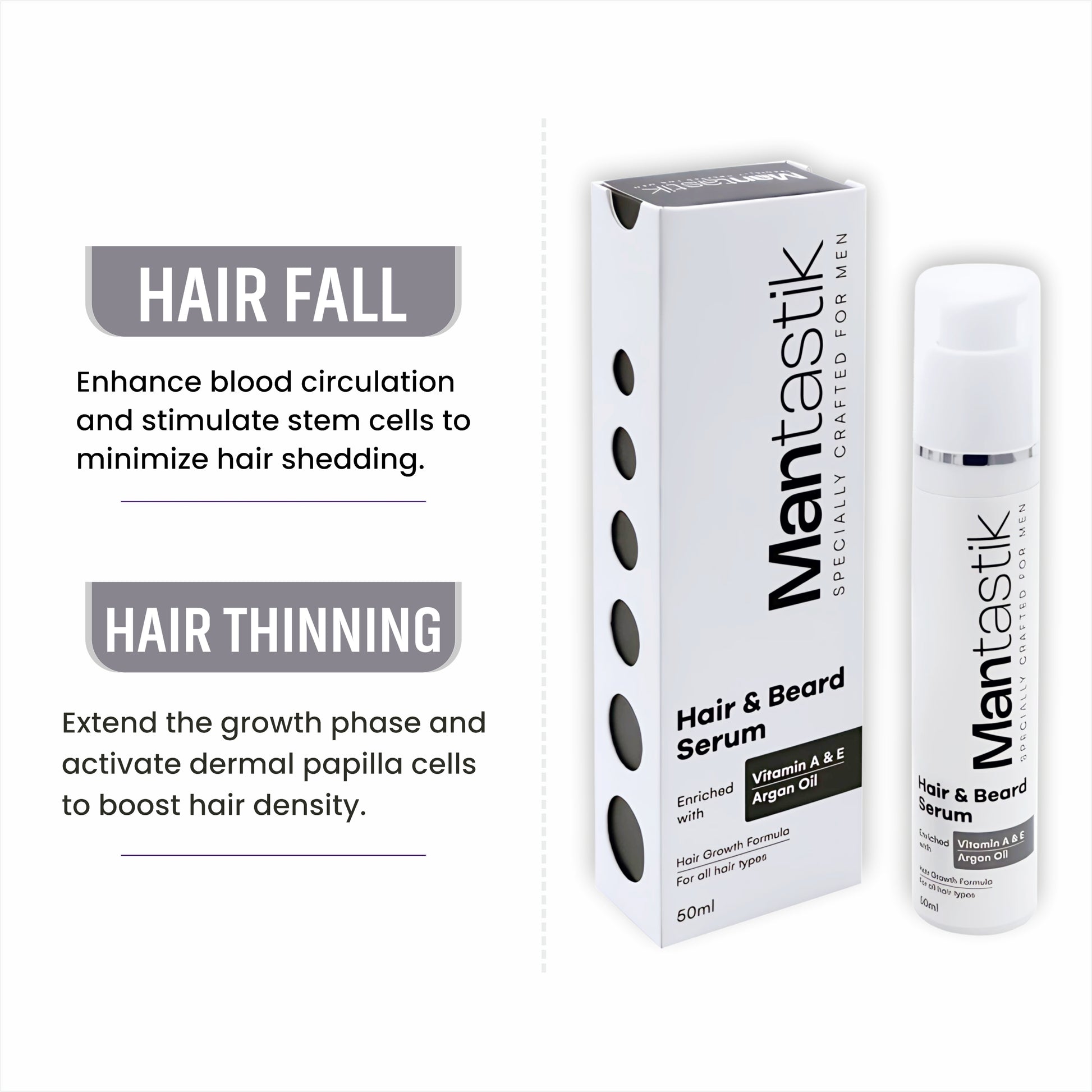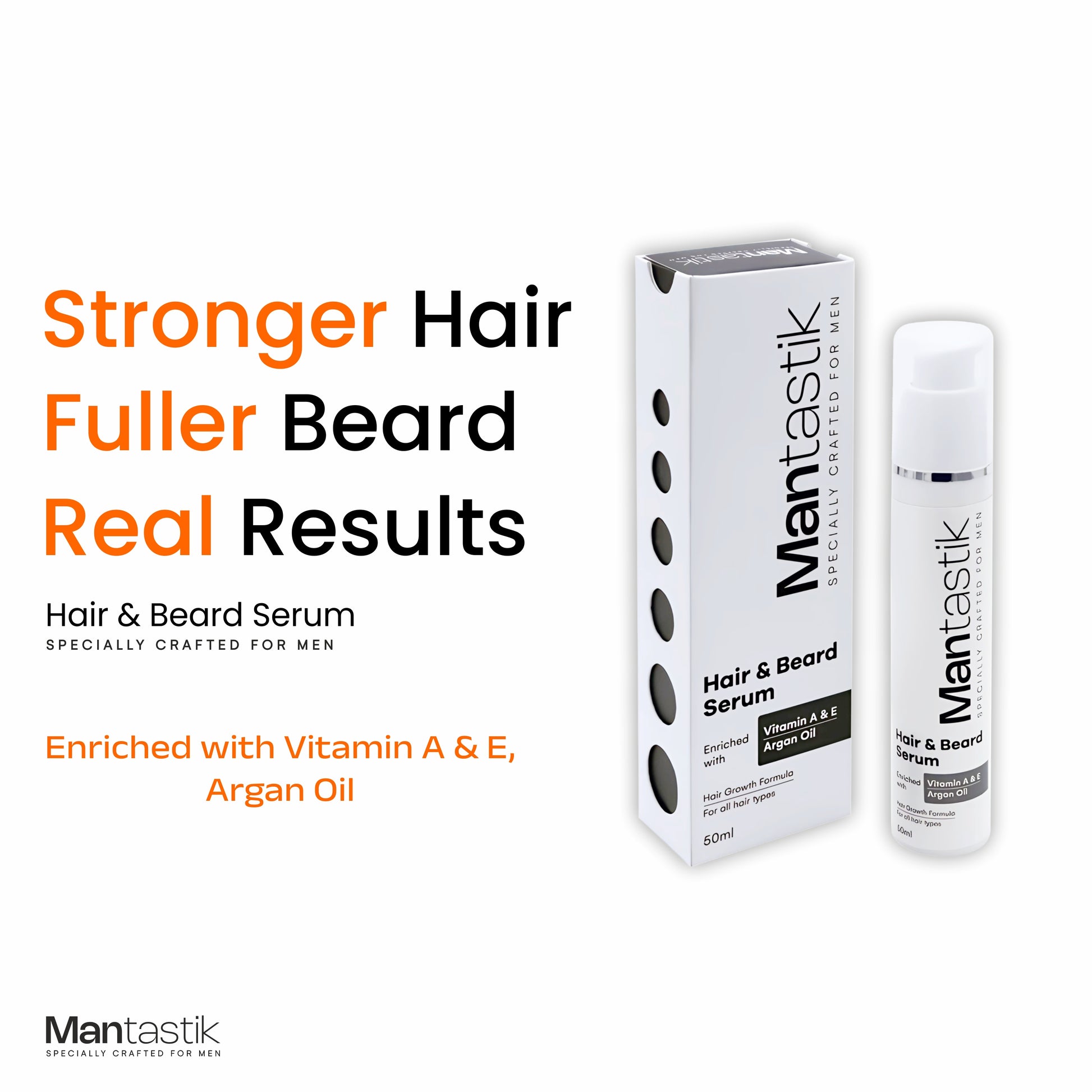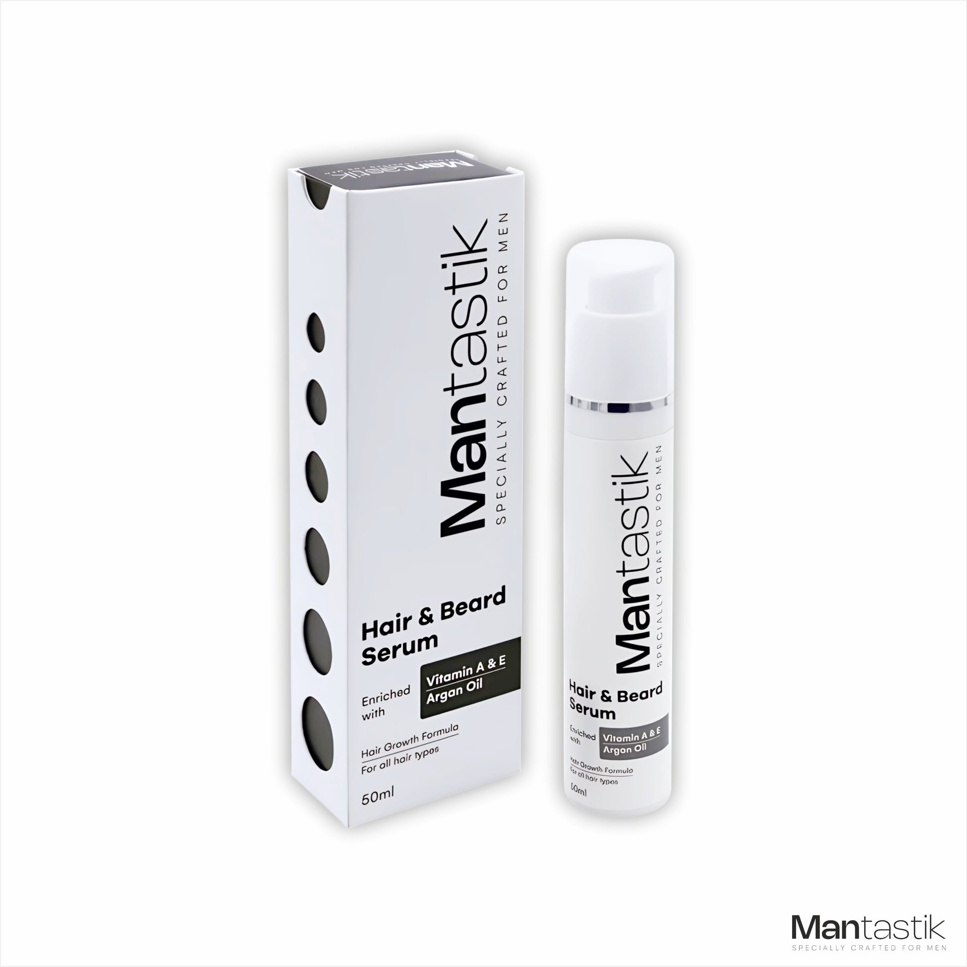 Transform your grooming routine with the Mantastik Hair & Beard Serum, enriched with Vitamin A & E and Argan Oil to nourish, strengthen, and revitalize your hair and beard. Designed for men, this lightweight formula promotes healthy growth while leaving your hair and beard feeling soft, smooth, and manageable.